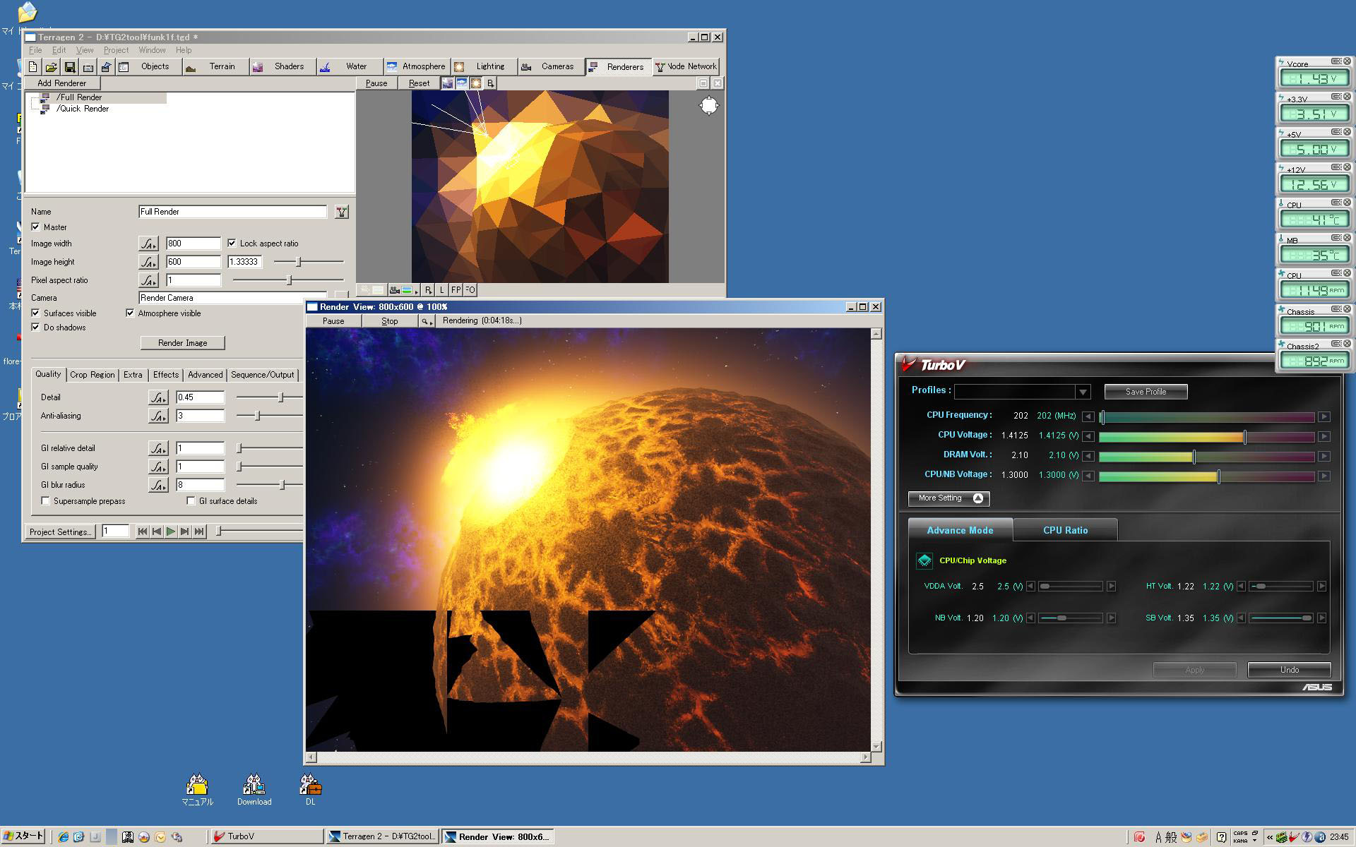 なんか相性なのか、設定なのか 詰めてもだめなら投げやりのAUTO設定でも満足にTG2のレンダリングが途中で ブルースクリーンに切り替わる さらに一気に再起動するもんだから電源系か、相性か・・ 電圧モリモリでようやく安定・・なのかな 800×600のサンプルはなんとかクリアできたけれど 今後もっと大きな画像や込んだ画像をレンダリングしてオチたら目も当てられんなぁ~ 同時期に組んだ安モンのメモリ搭載のPCは難なく動いているのでなんか悔しい メモリを買い替えててみるか、とりあえずこのまま様子見するか memtestすら途中で再起動かかるくらいだかもしかして何かが初期不良??? ってなことやって今日の一日を無駄に過ごしました・・・・・・・・・OTZ |